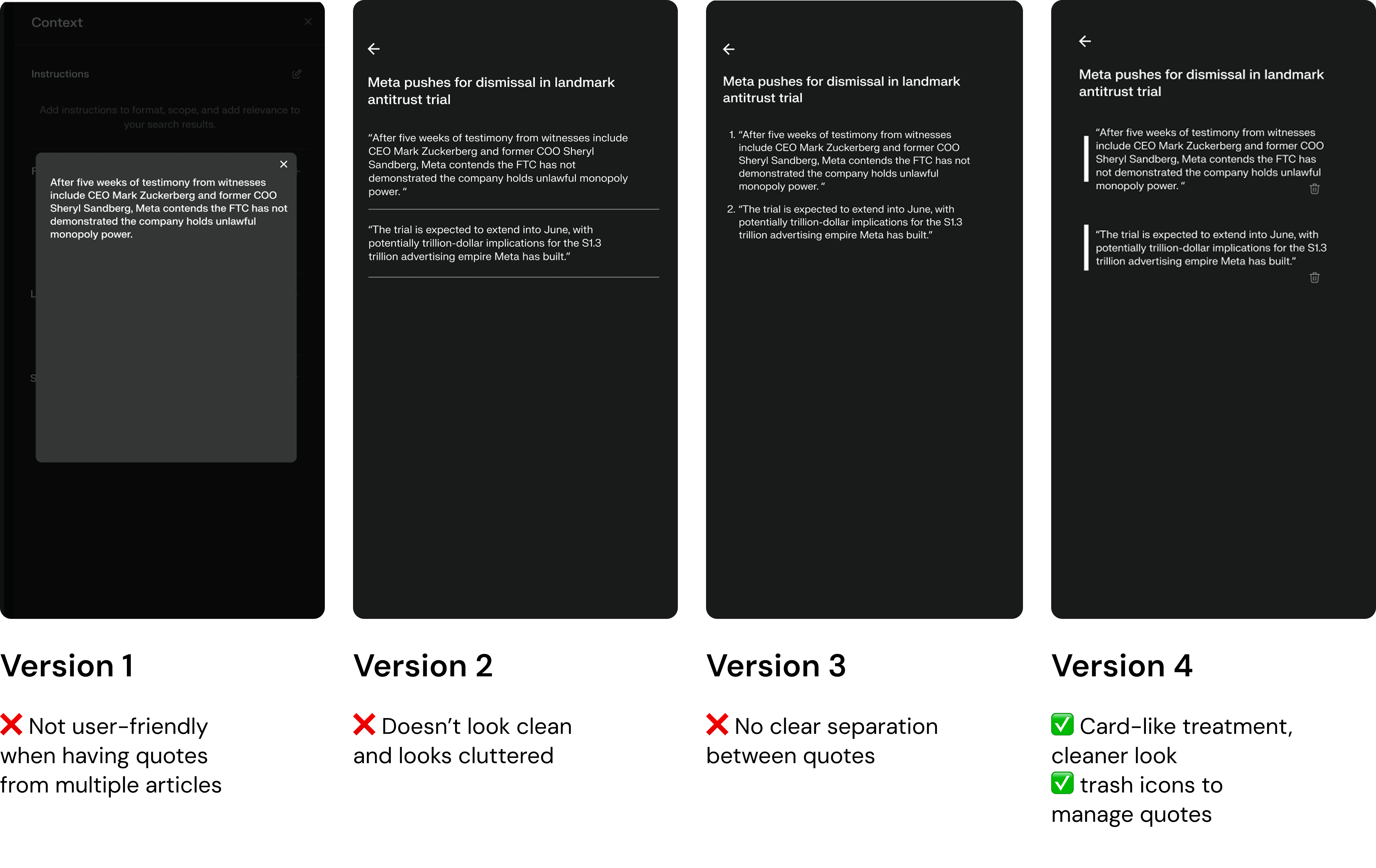 I explored different visual styles for how saved quotes would appear. Through user testing, I found that users preferred a cleaner look.